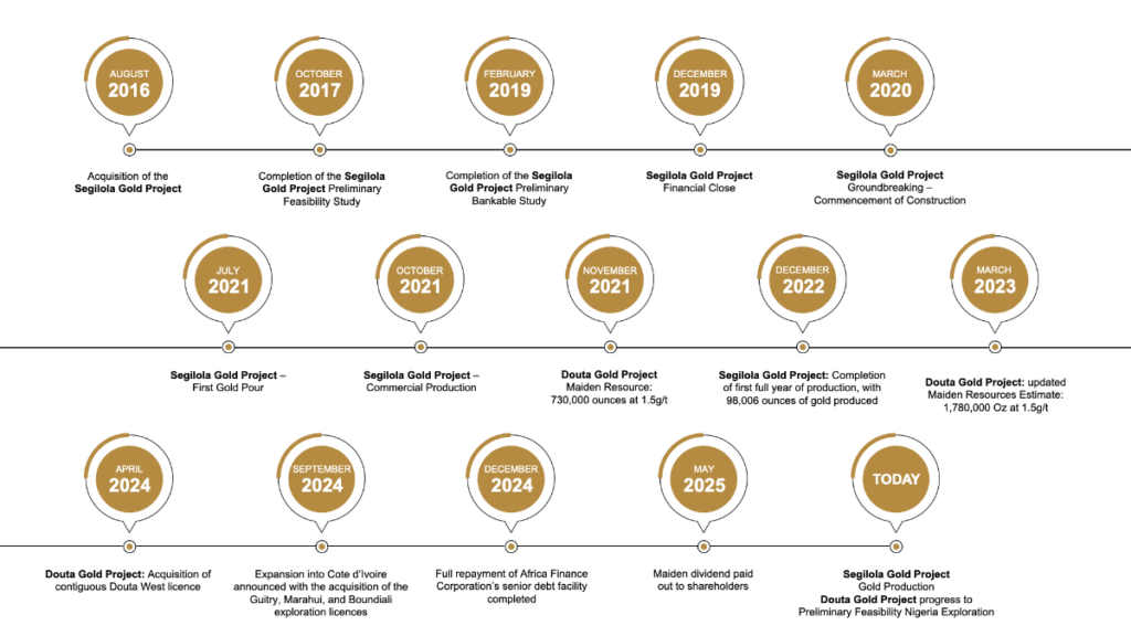 Since the completion of its 100% owned Segilola Gold Mine, located in south-west Nigeria in Q4 2021,At Segilola, In 2025, Thor has entered into its fourth full year of production, having produced 85,057 ounces of gold in 2024, 84,609 ounces in 2023, and 98,006 ounces in 2022.
