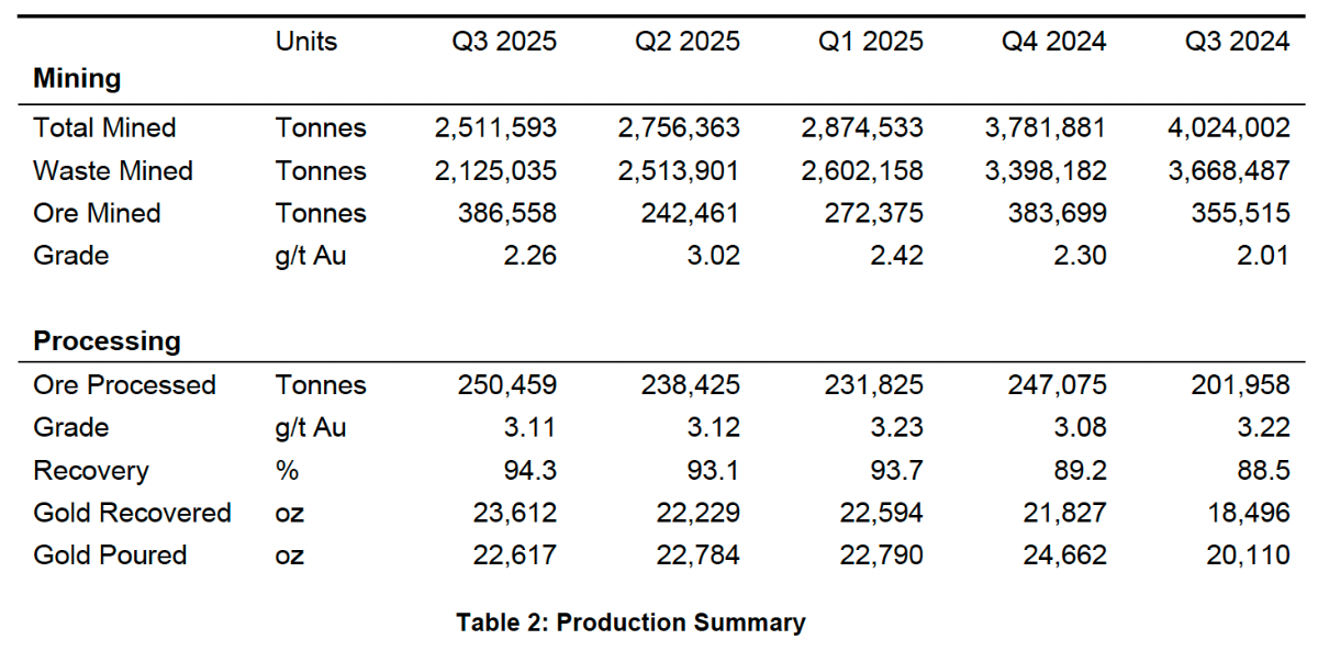 - Gold bullion inventory of 122 oz and gold doré inventory of 5,668 oz at September 30, 2025